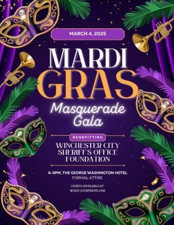 The Winchester City Sheriff’s Office Foundation Mardi Gras Masquerade Gala on Tuesday, March 4 at the George Washington Hotel. 6-9PM